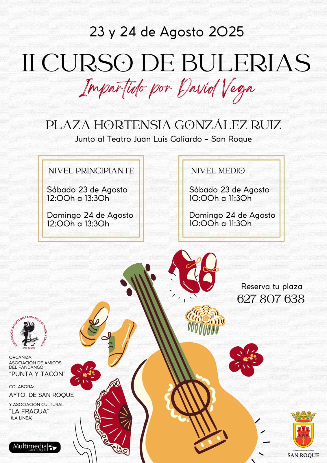 El segundo Curso Intensivo de Bulerías de Jerez tendrá lugar los días 23 y 24 de agosto en el local municipal ubicado en la Plaza Hortensia González Ruiz, junto al Teatro Juan Luis Galiardo.